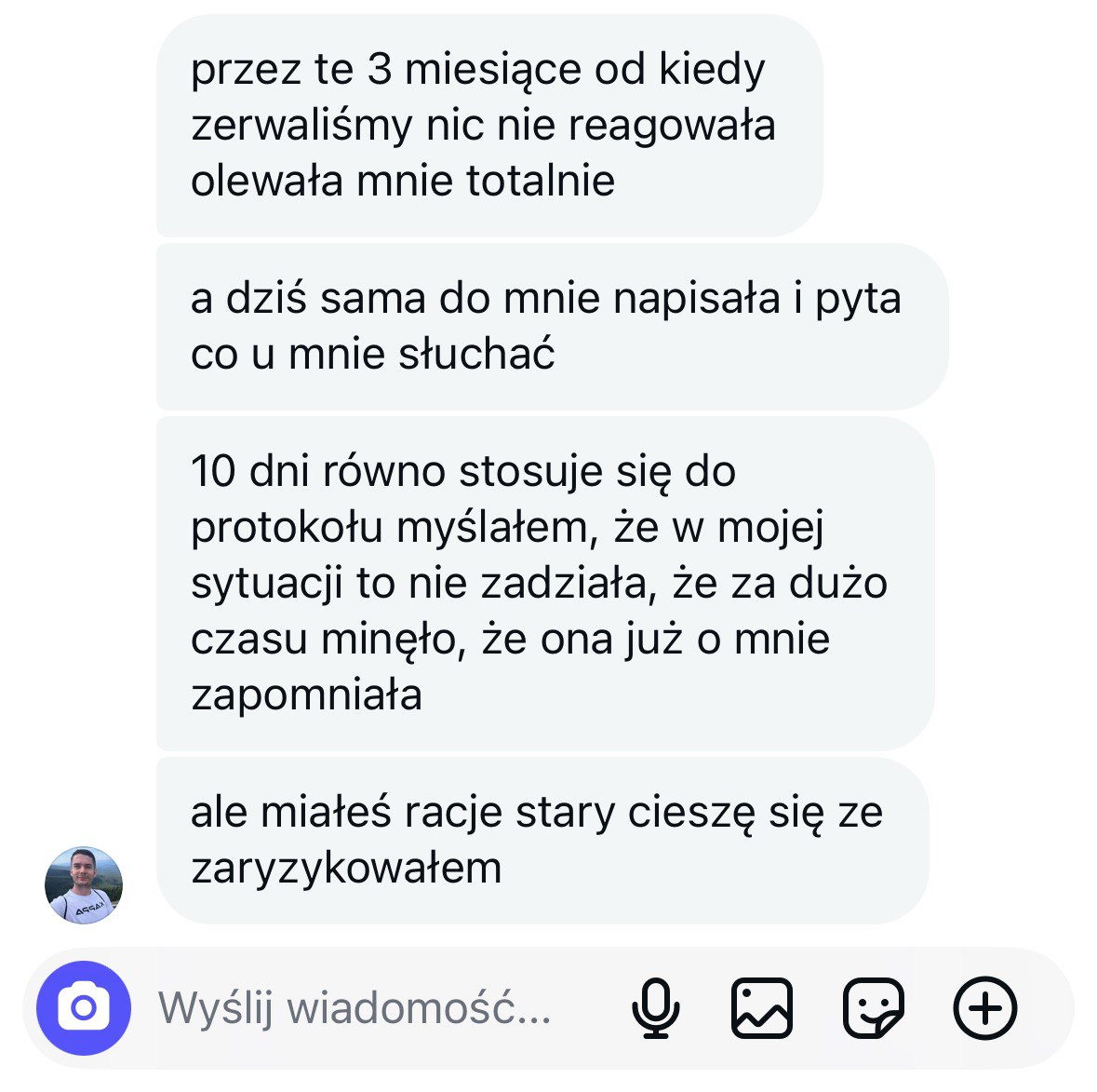 Jeśli przez 3 miesiące po rozstaniu dalej robisz to samo – pisanie, tłumaczenie się, błaganie, desperackie wrzutki – to dla niej jesteś dalej tym samym facetem. Czas nie zmienia percepcji. Ty ją utrwalasz.
