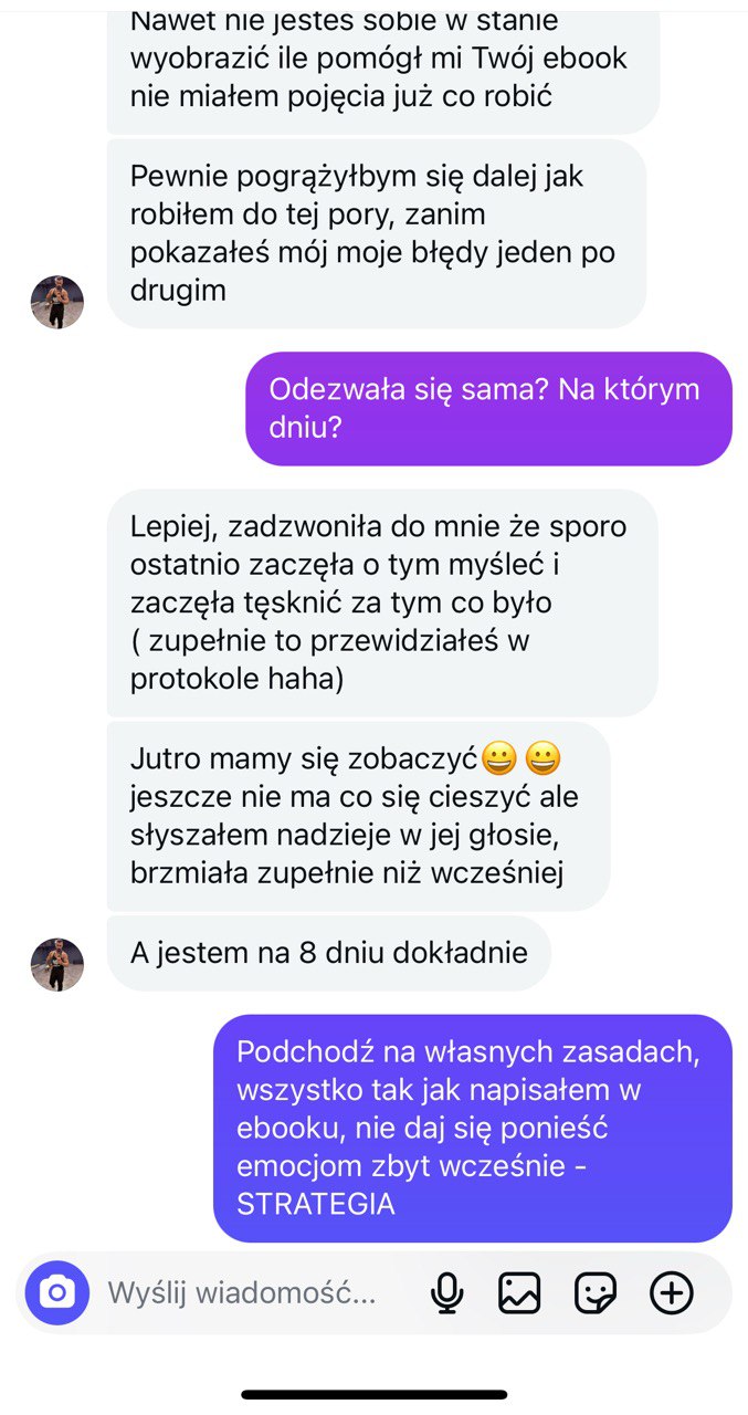 „Protokół Powrotu” to 14-dniowy, konkretny plan, który pokazuje Ci dokładnie: co robisz dziś, co robisz jutro i czego nigdy więcej nie robisz jeśli chcesz odzyskać konkretną kobietę – byłą, obecną lub tę, która się oddala. Nie teoria. Nie motywacja. Konkretne zadania na każdy dzień.